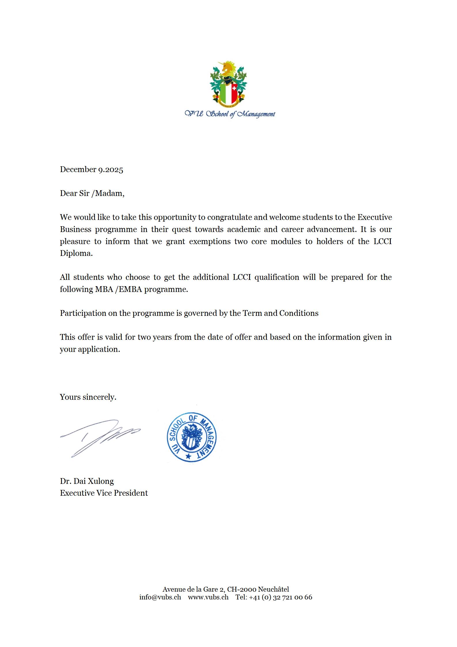 瑞士维多利亚大学关于认可IAB LCCI资格申请MBA及EMBA的通知