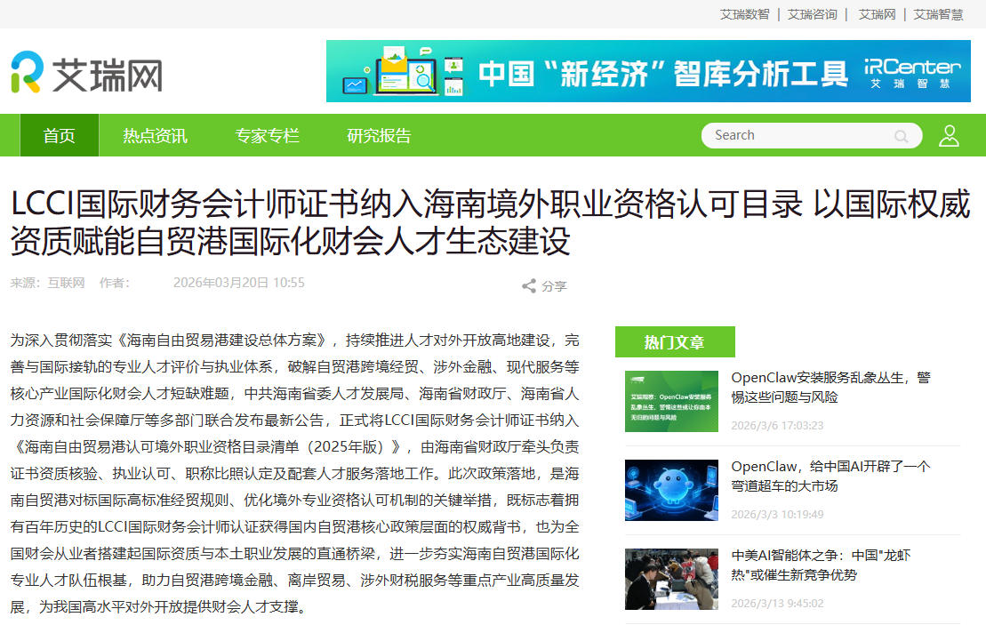 艾瑞网:LCCI国际财务会计师证书纳入海南境外职业资格认可目录 以国际权威资质赋能自贸港国际化财会人才生态建设